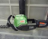 Die Maschine verfügt über eine 60cm Schnittlänge mit einem Messerabstand von 23mm außerdem verfügt die Heckenschere über einen Drehbaren Handgriff der das Arbeiten erleichtert.
