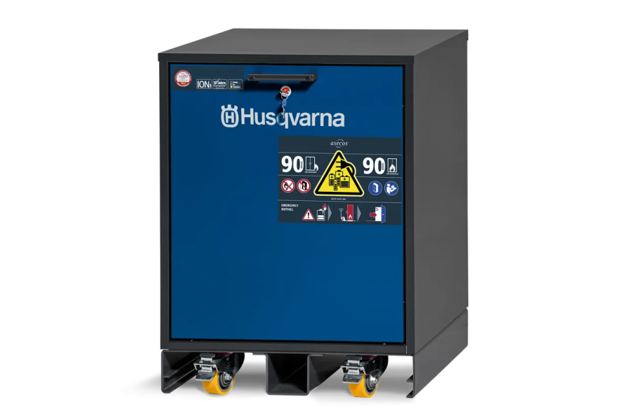 Der Akku Ladeschrank S von Husqvarna wurde entwickelt, um Lithium-Ionen-Akkus auf sichere Weise zu lagern und aufzuladen. Der 230-V-Untertischschrank kann aufgrund seiner geringen Höhe problemlos unter Arbeitsplatten platziert werden und bietet 90 Minuten Feuerwiderstand von außen nach innen und von innen nach außen*. Ausgestattet mit einem Rauchmelder zur Früherkennung von Entstehungsbränden und einem potentialfreien Alarmsystem zur sofortigen Weiterleitung von Alarmen. Anschlussfertige Steckdosenleisten und Regale im Lieferumfang enthalten.